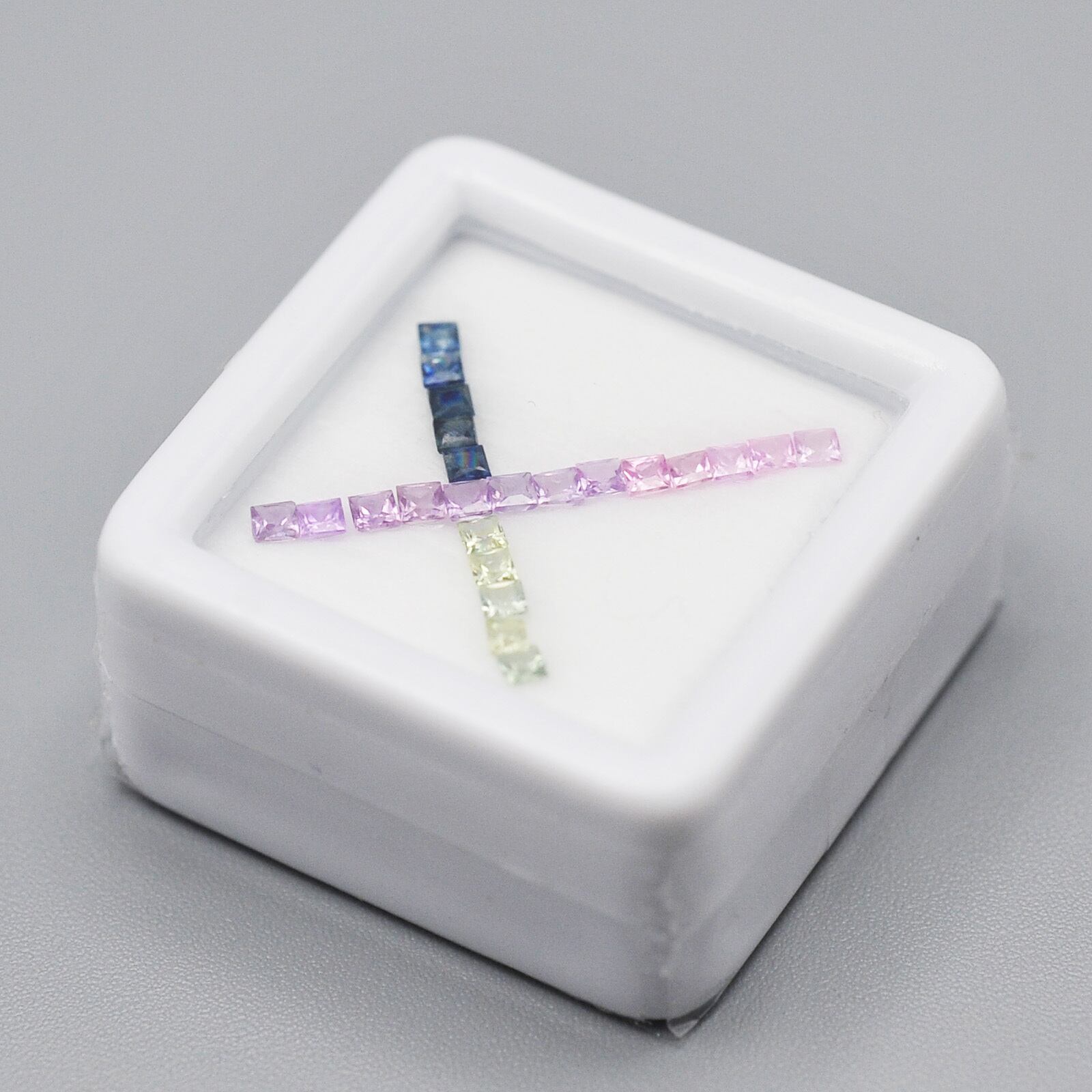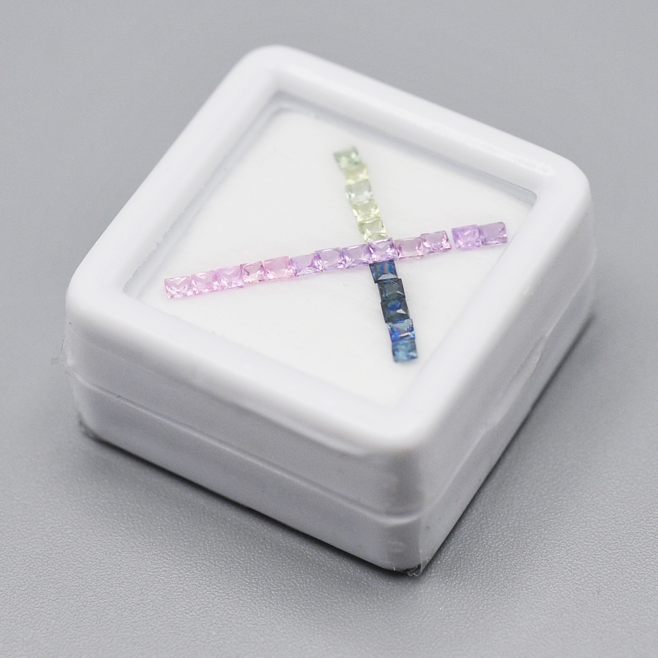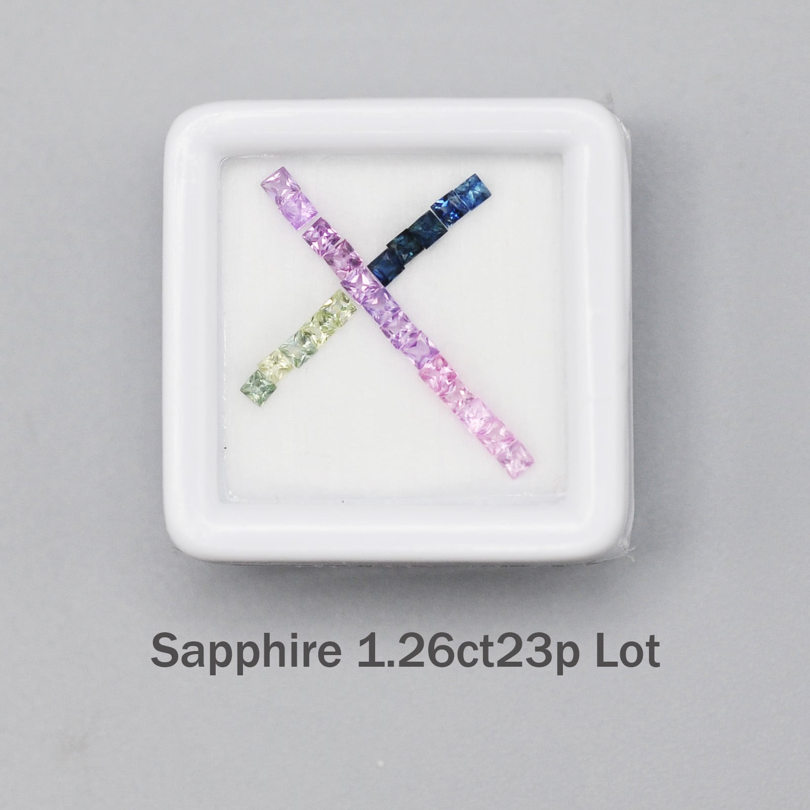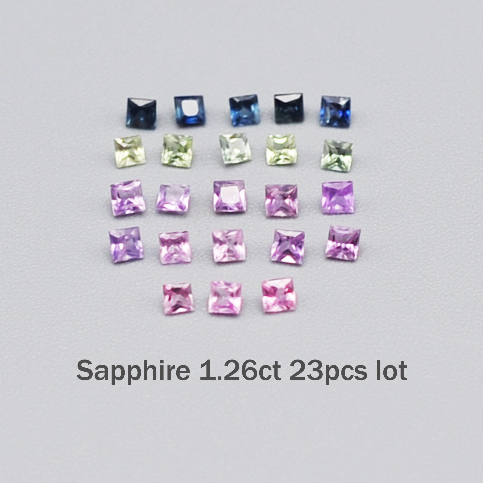 パステルカラーのカラフルで透明感のあるプリンセスカット(スクエアカット)のサファイア23石セットです。
