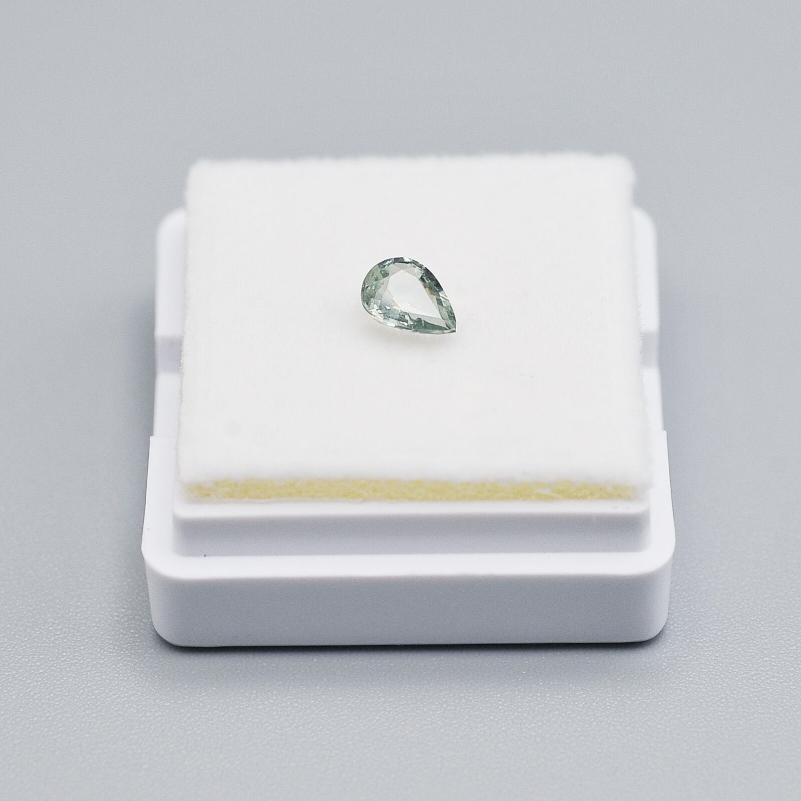 透明感のあるペアシェイプカットで、角度によって淡いグリーンの中に輝きが広がります。