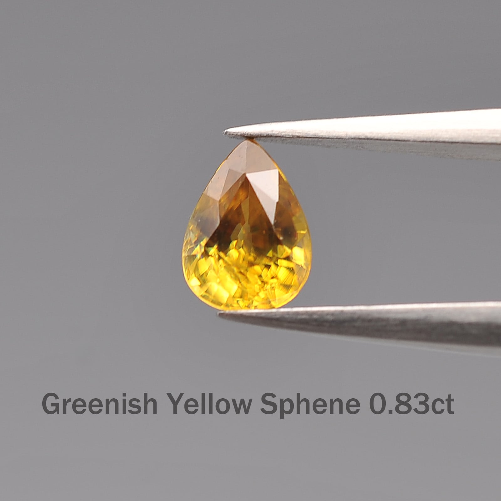 こちらはマダガスカル産の天然スフェーン(非加熱)で、0.83カラットのペアシェイプカットです。