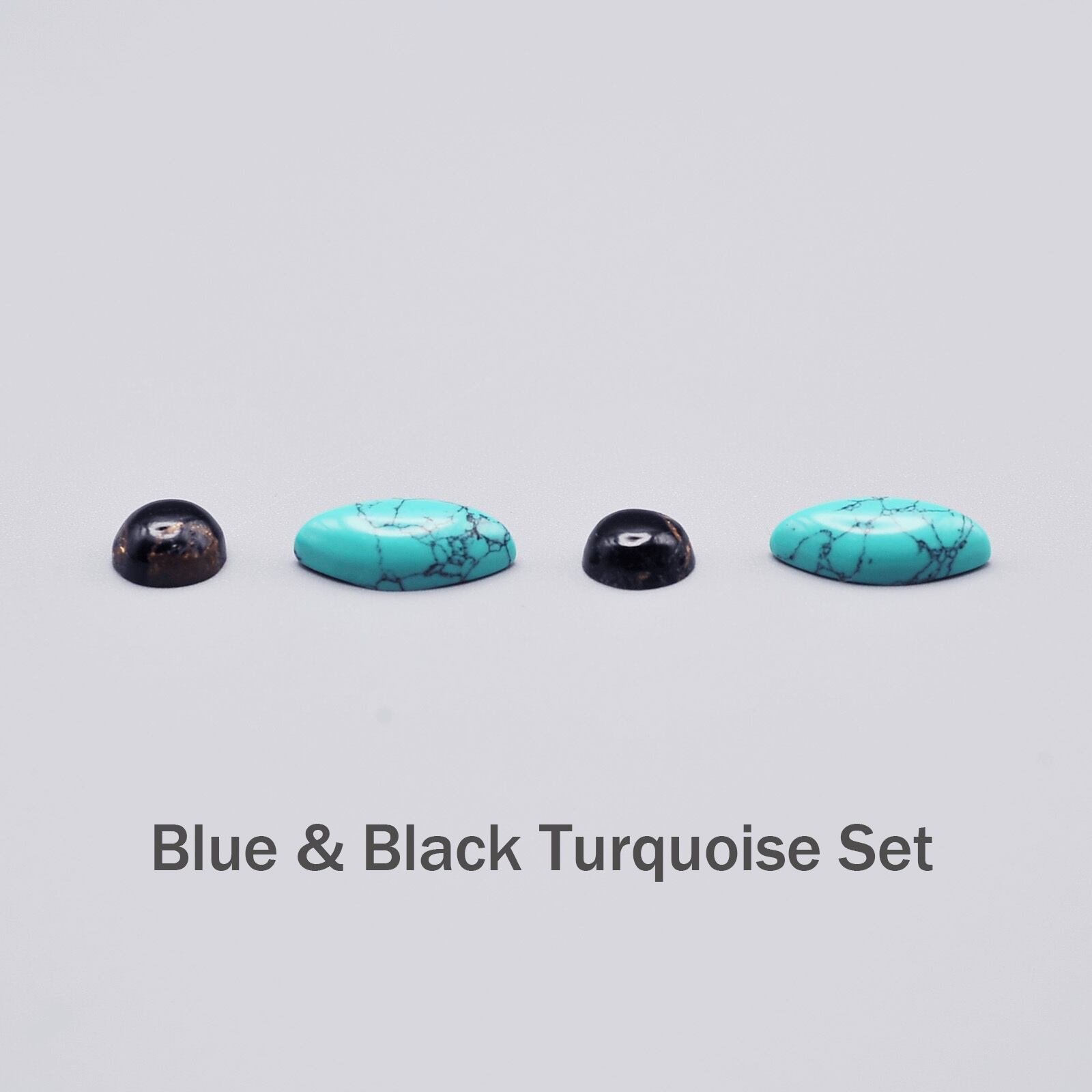 鮮やかな空色と黒のスパイダーウェブ模様が美しいターコイズに、金属片を閉じ込めたユニークなオイスターコッパーターコイズを組み合わせた特別な4ピースセット。