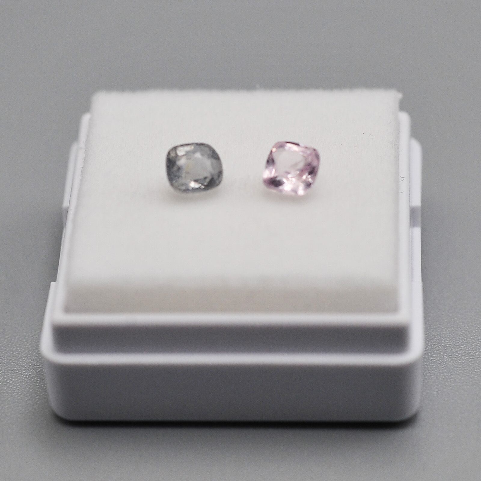 同じクッションカットで揃えた、スピネル淡色2石セットです。色の対比が可愛く、ピアスや左右違いのリング、2石使いのデザインにもおすすめです。